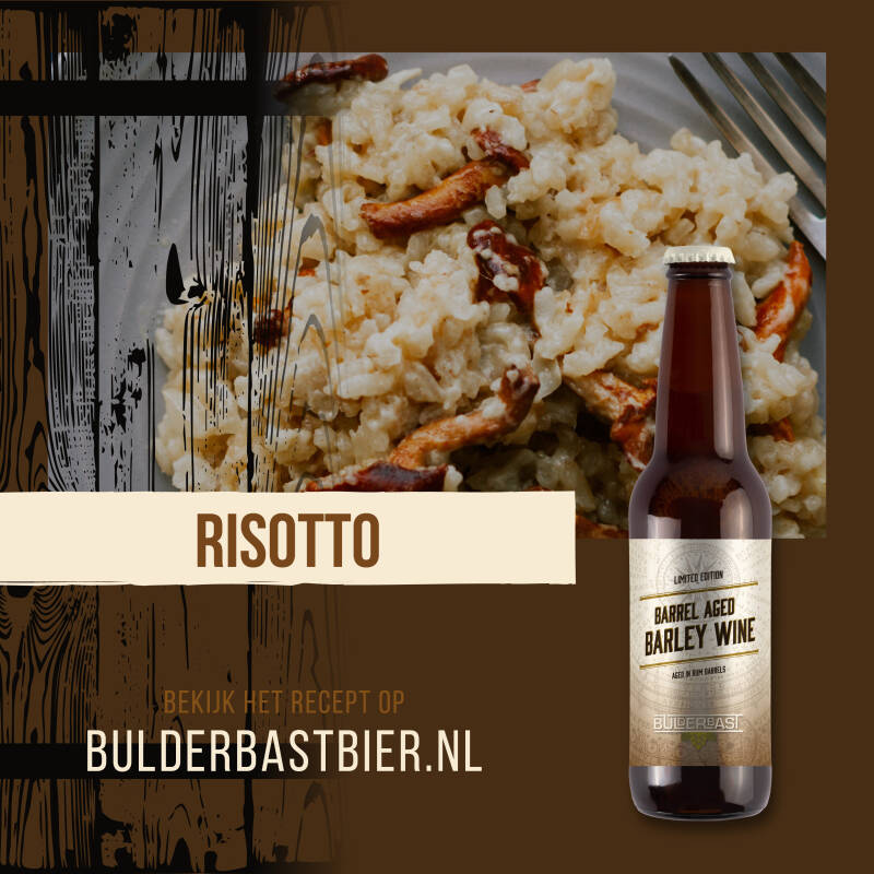 Snipper de ui en pers de knoflook. Fruit beide aan in een beetje boter tot het een beetje begint te glanzen. Snijd de champignons en de kip in stukken. Voeg de kip toe aan de ui en de knoflook. Bak tot de kip gaar is. Doe de rijst in de pan en bak ligt op tot de korrels glazig beginnen te worden. (Blijf goed doorroeren). Voeg vervolgens de Barel aged Barley Wine toe en laat dit door de rijst opnemen. Voeg vervolgens lepel voor lepel de bouillon toe. Let erop dat je de bouillon tegen de kook toevoegt en pas weer aanvult zodra de rijst de bouillon bijna volledig heeft opgenomen. Herhaal voorgaande totdat de rijst gaar is. Voeg vervolgens een klein beetje boter toe en de parmazaanse kaas. Roer door tot de kaas gesmolten is. Bon Apetit!
